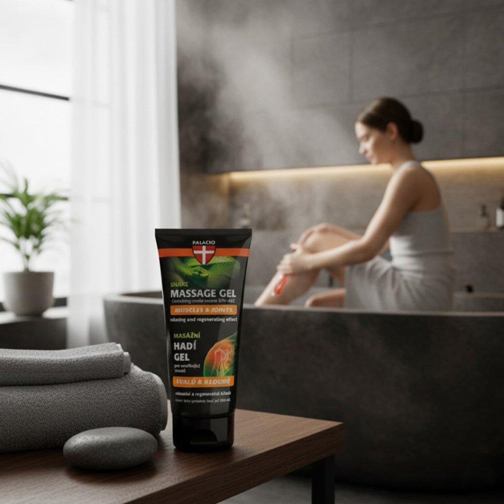 PALACIO Hadí jed masážní gel v tubě spojuje moderní kosmetickou technologii s přírodními extrakty. Obsahuje inovativní peptid SYN®-AKE, který napodobuje účinky hadího jedu a podporuje uvolnění svalového napětí. Gel je obohacený o chladivý mentol, kafr a eukalyptový olej pro okamžitý pocit úlevy. Směs 20+ bylinných extraktů (kostival, měsíček, arnika, kaštan koňský, levandule aj.) napomáhá regeneraci, prokrvení a celkové revitalizaci pokožky. Díky praktické tubě se snadno aplikuje kdykoli a kdekoli.