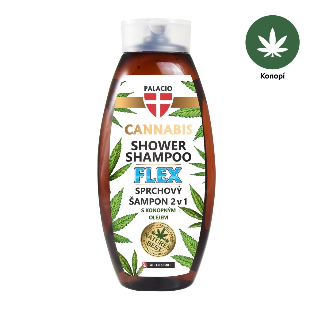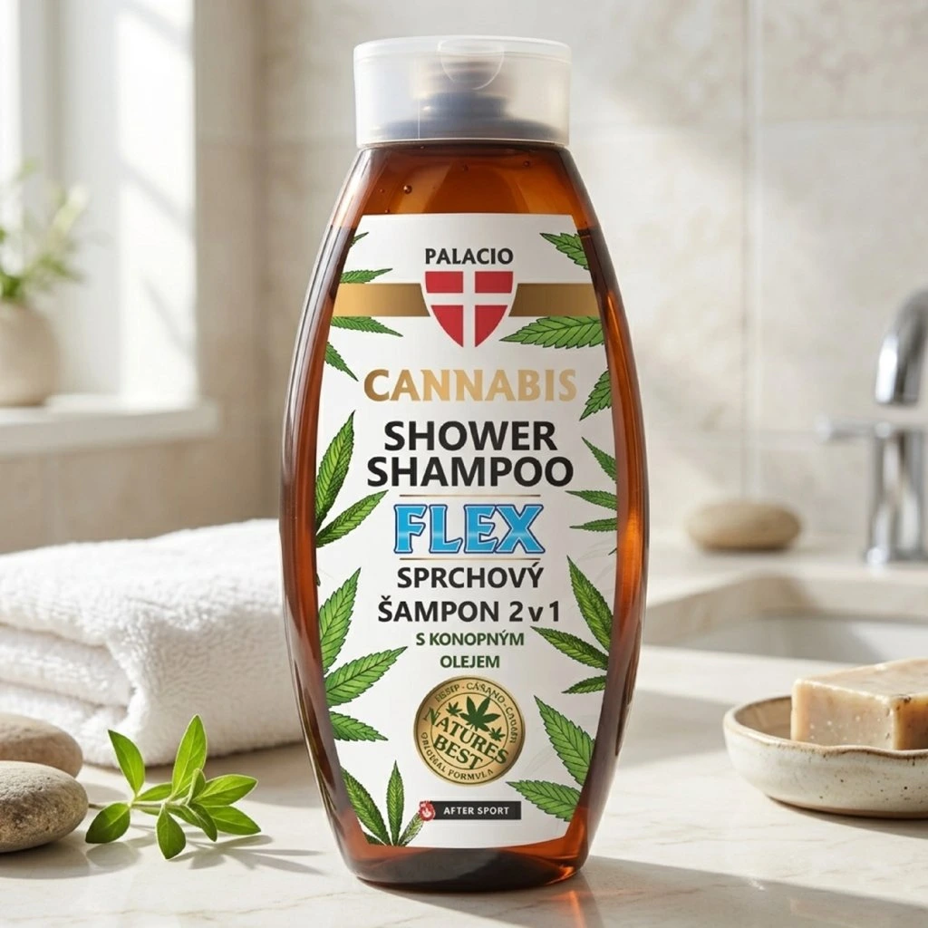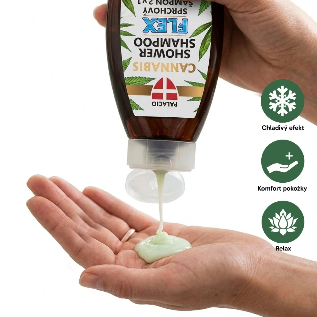 Sprchový šampon FLEX je ideální po sportu nebo cestování. Pro následnou péči o tělo použijte konopný tělový krém nebo masážní gel PALACIO.